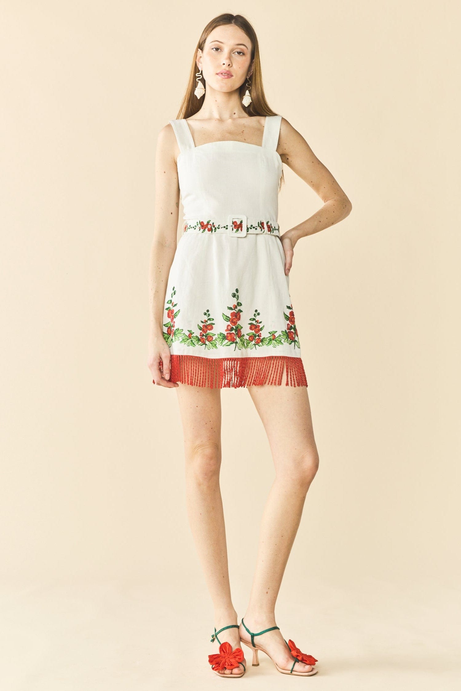 La mini-jupe Sarah Bird est une invitation à la piste de danse. Son ourlet est bordé de franges tressées rouges qui accompagnent vos mouvements, conçues pour capter la lumière d'une boule à facettes et créer l'ambiance. Sa taille cintrée et son dos élastiqué sculptent la silhouette tout en offrant une allure décontractée. Des œuvres peintes par Larsen McDowell ornent le tissu, chaque motif floral étant placé avec soin.