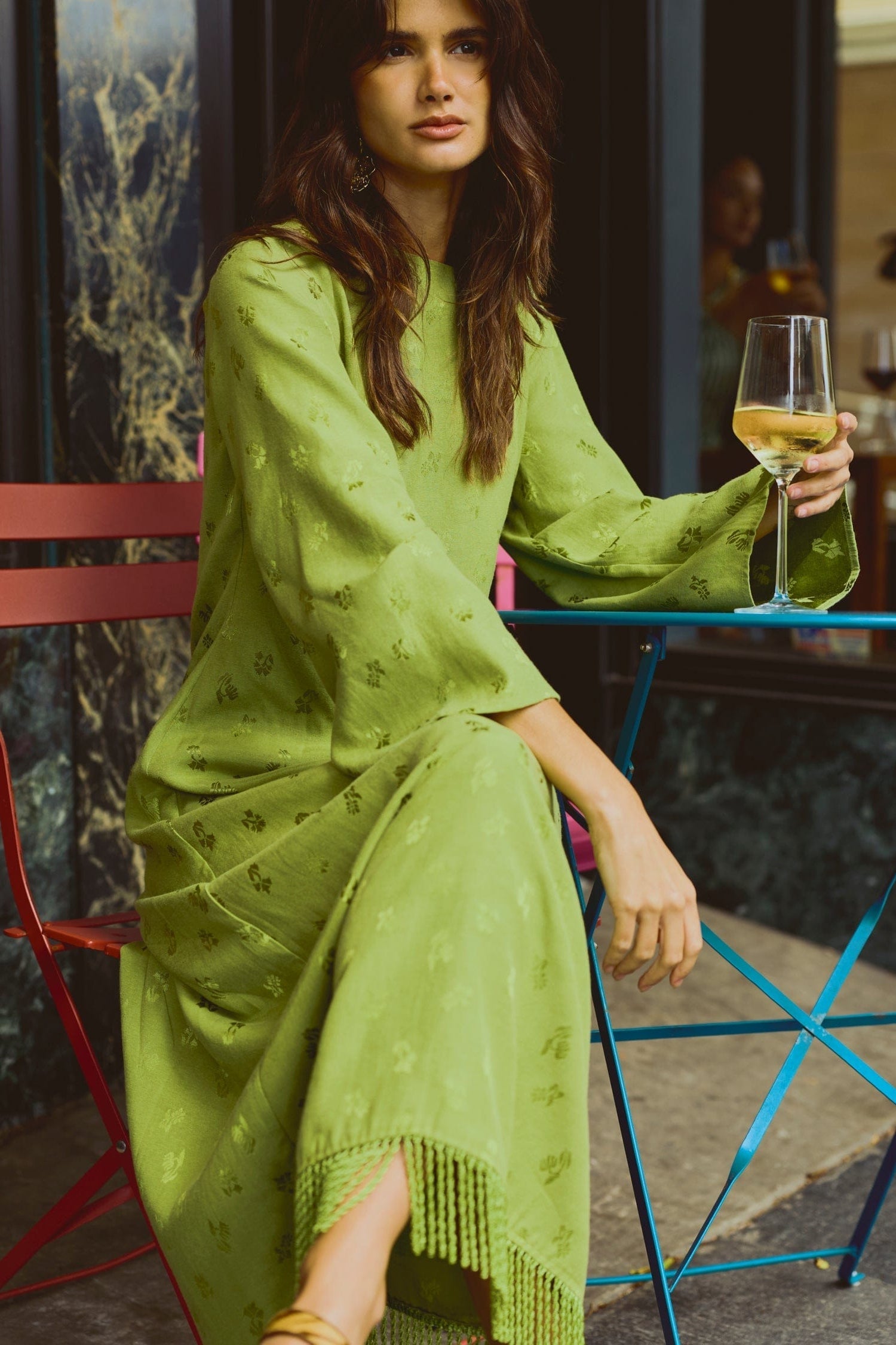 Découvrez Ariana. Confectionnée en jacquard soyeux, cette robe est idéale pour les soirées. Son ourlet doublé de franges est parfait pour danser. Sa coupe décontractée assure un confort optimal. Ses manches évasées longueur bracelet et sa simple ouverture goutte d'eau dans le dos, ornée d'un bouton unique, apportent la touche finale à un imprimé floral subtil.