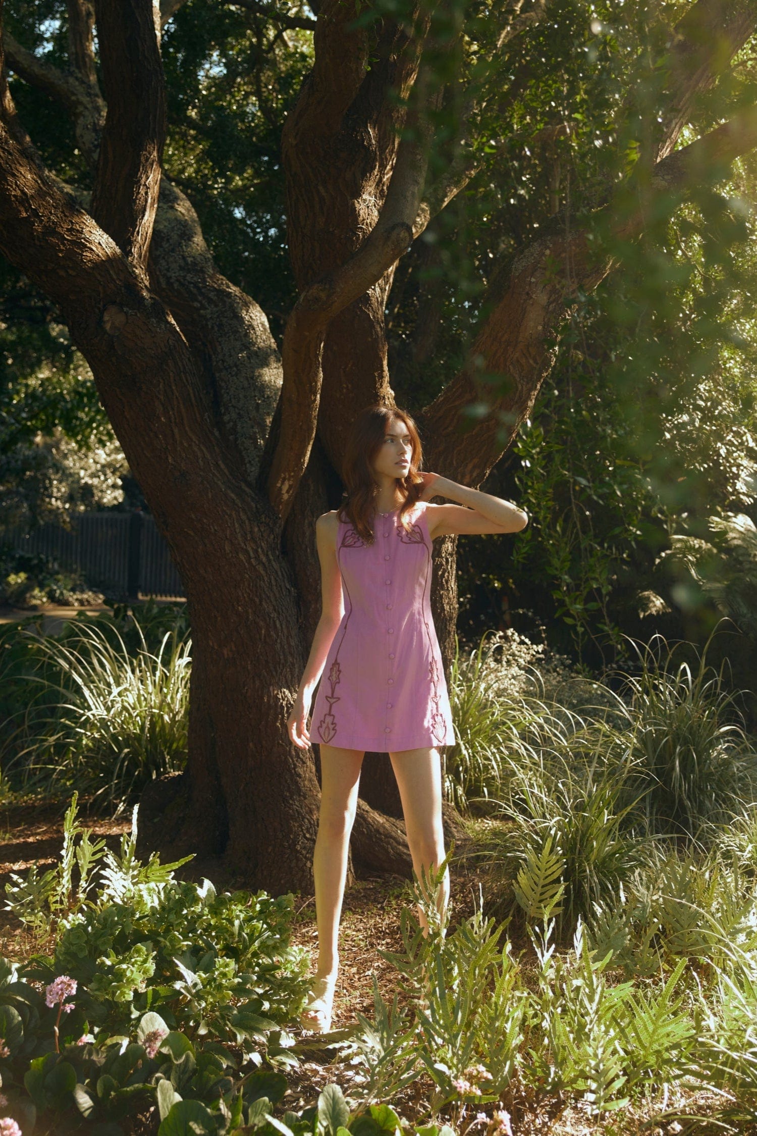 La robe Harper est une mini-robe boutonnée en coton et lin rose, rehaussée d'une broderie corde violette à motif géométrique ludique. Avec sa coupe structurée et décontractée et son côté vintage, c'est la pièce idéale pour siroter un spritz à l'heure dorée.