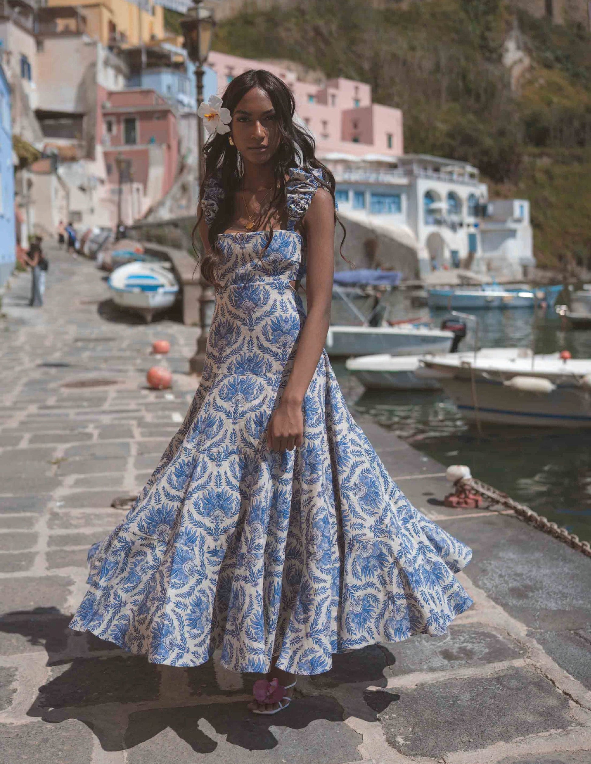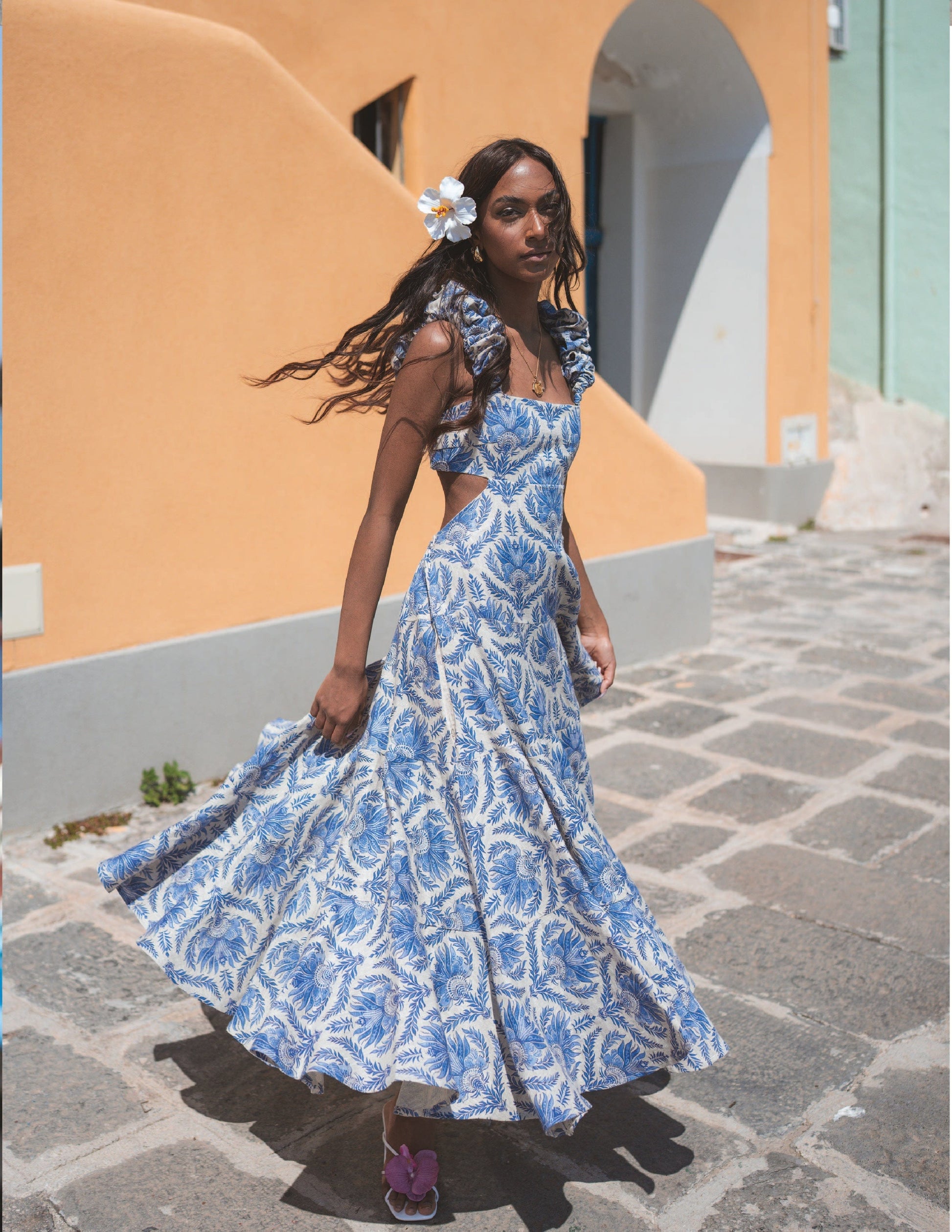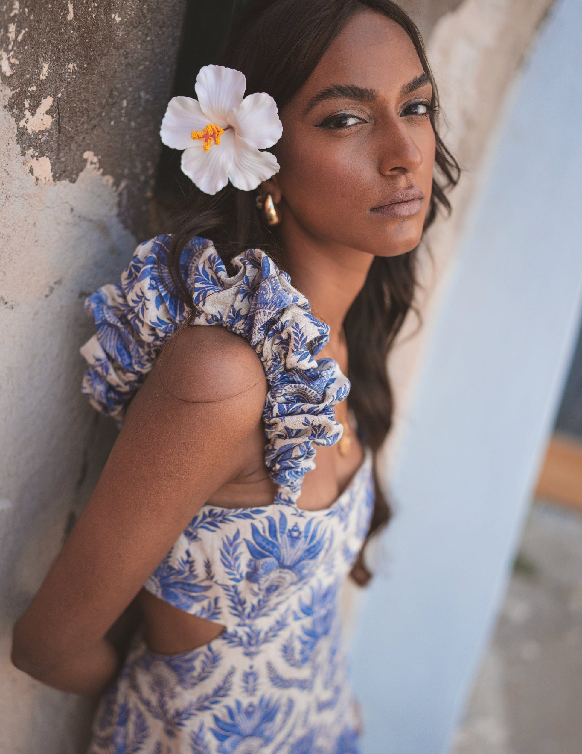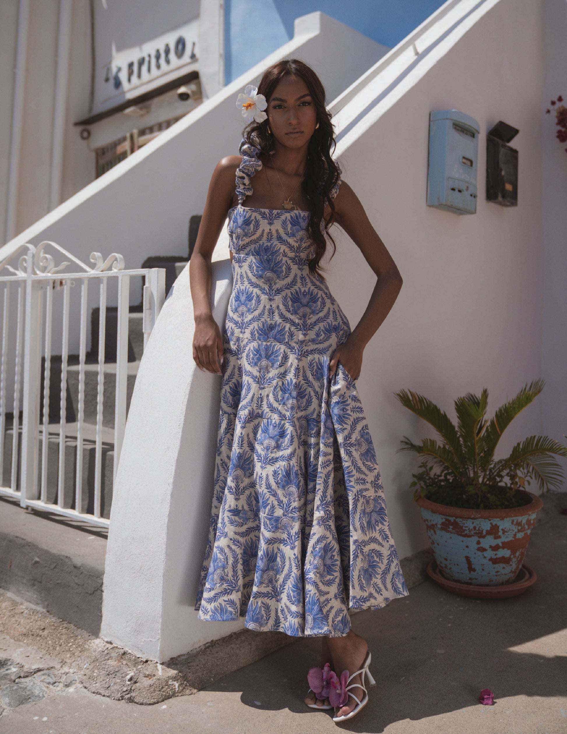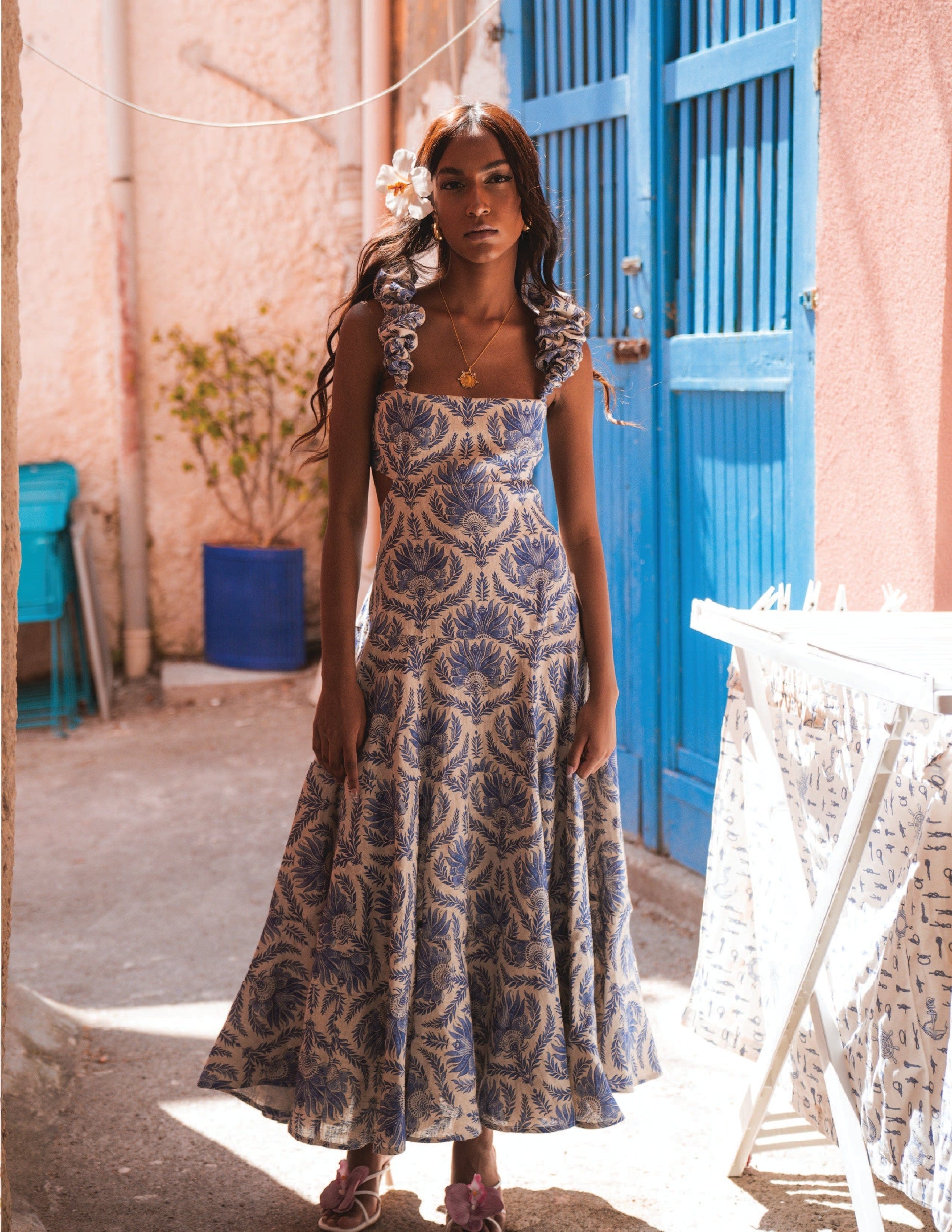 Véritable pièce maîtresse de votre garde-robe estivale, la robe Elektra en Fleur est confectionnée en lin biologique européen impeccable, imprimé d'un saisissant motif à carreaux bleus, provenant d'une filature familiale lituanienne. Sa silhouette structurée et aérienne présente un corsage flatteur avec un élastique dissimulé pour le maintien, des bretelles bouffantes façon chouchou et un dos ouvert avec un lien et une fermeture à crochets. Sa jupe circulaire volumineuse à volants offre une aisance spectaculaire et, oui, elle est dotée de poches. C'est la robe parfaite pour virevolter le long de la côte amalfitaine, se rendre à une fête estivale ou tout simplement rayonner au quotidien.