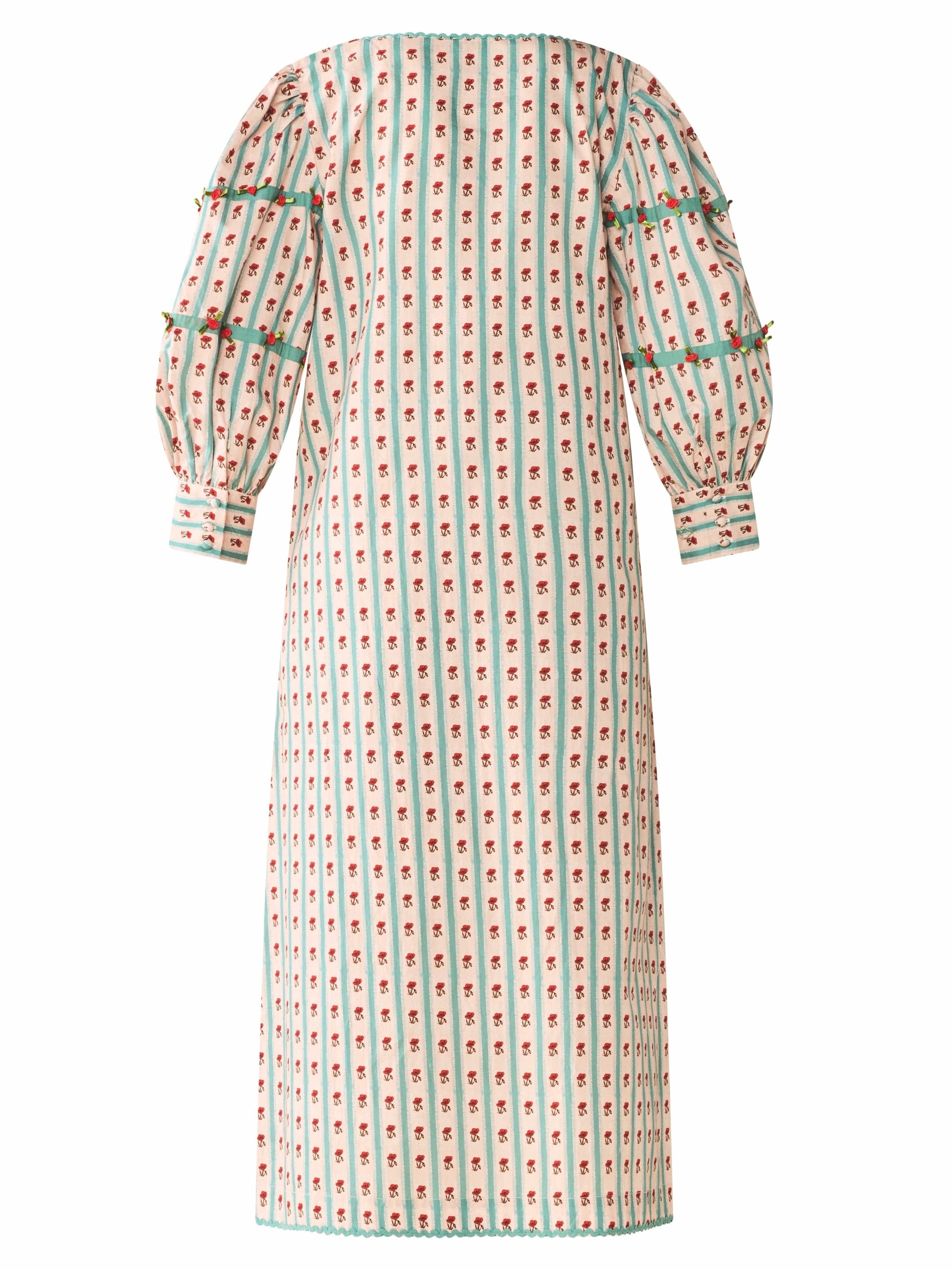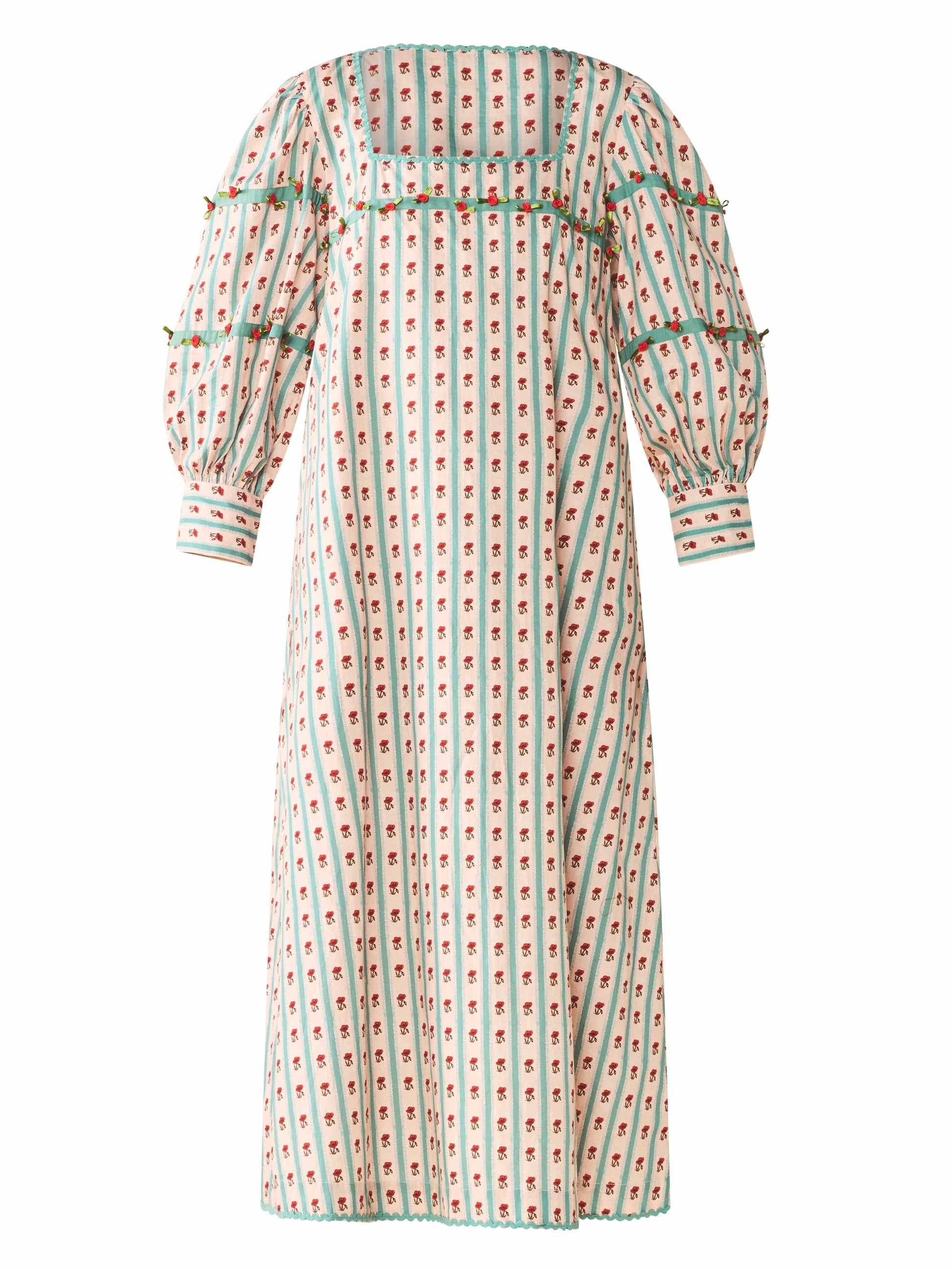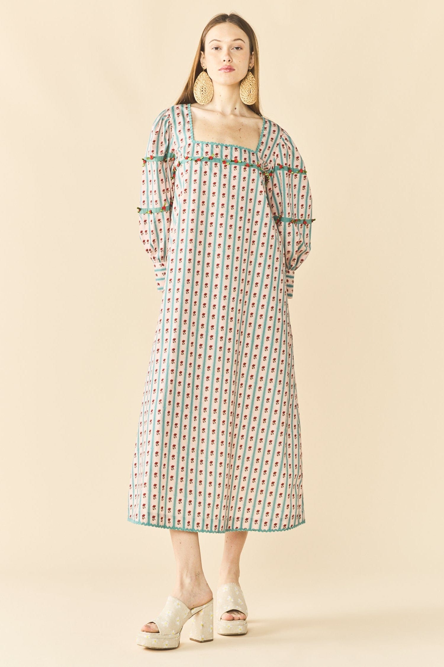 Délicat mais jamais ennuyeux. Tara est un caftan décontracté avec sa coupe droite et sa longueur théâtrale. Il est orné d'un imprimé floral intégral, adouci par des mini-roses, des rubans et un joli bord plissé. Encolure carrée, entièrement doublé, il est parfait pour toutes vos occasions, des garden-parties aux courses.