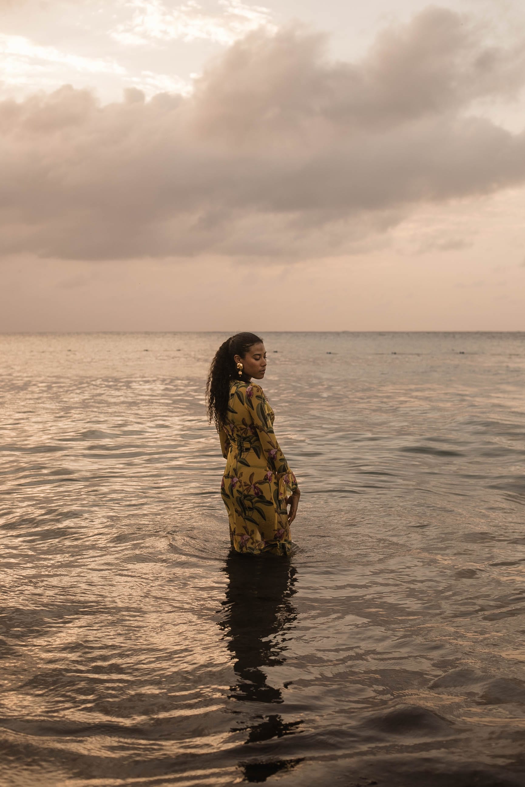 La robe Amari, couleur orchidée jaune, est confectionnée dans une maille moulante. De longueur midi et légèrement volantée aux poignets, elle est idéale pour un rendez-vous galant en vacances ou comme paréo pour dévoiler votre peau.