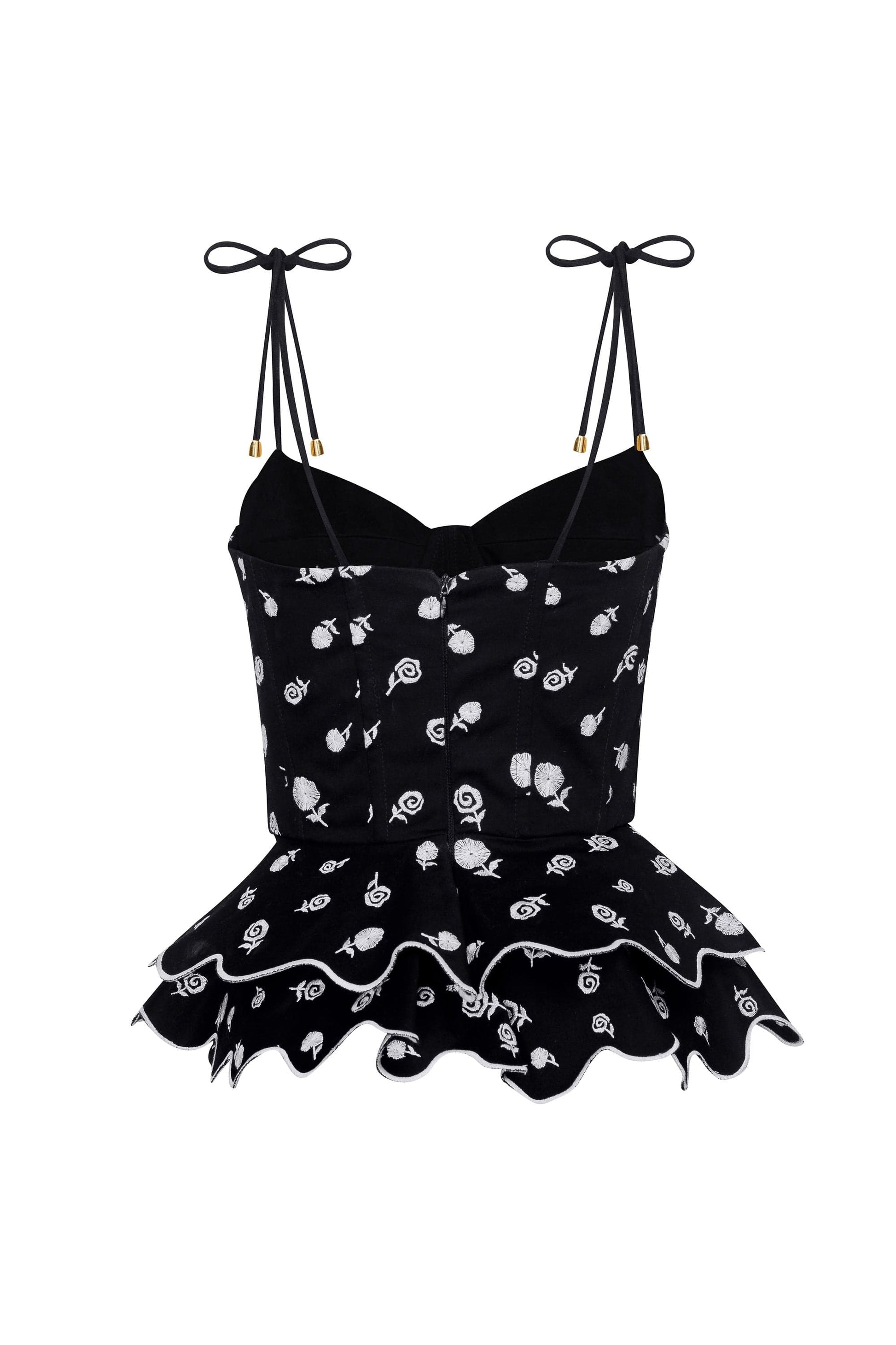 Le haut péplum Rosita incarne l'essence romantique et le style de notre marque. Confectionné en coton noir brodé de délicates roses blanches et orné de deux épaisseurs d'ourlets blancs brodés, il allie sophistication et romantisme. Ce haut élégant offre un style moderne et jeune.