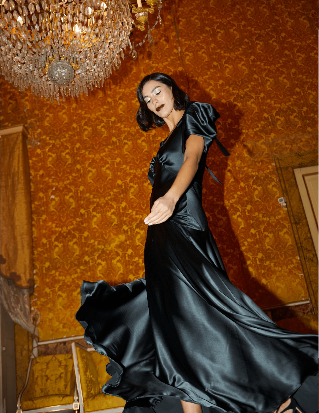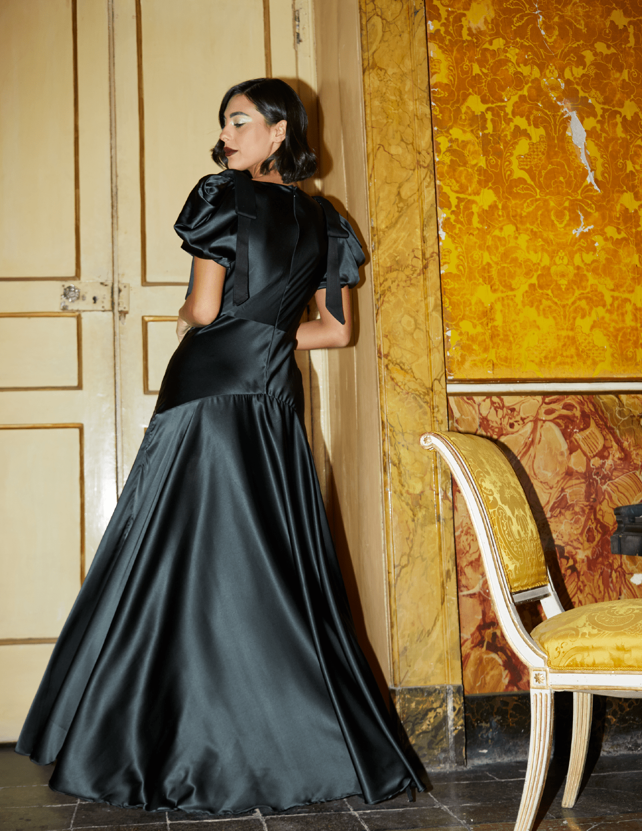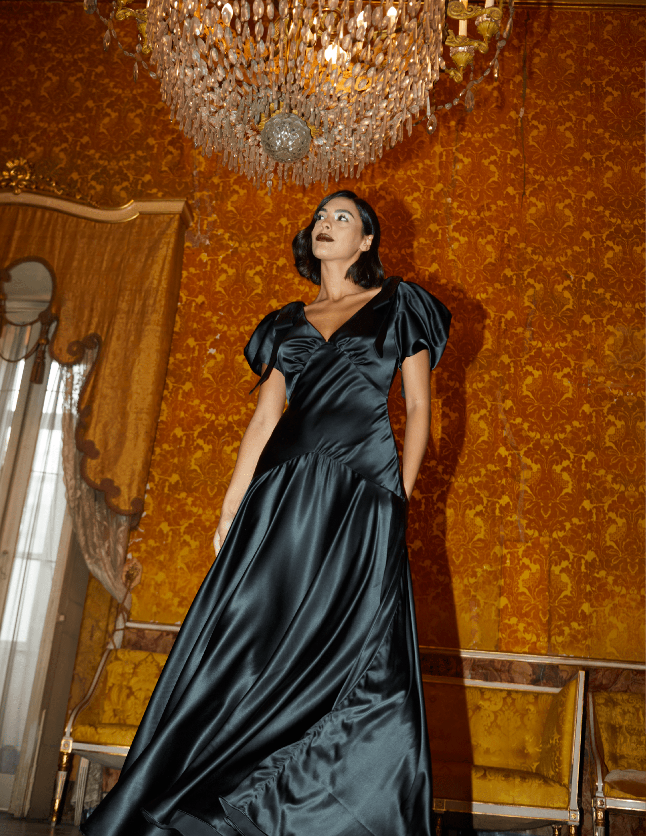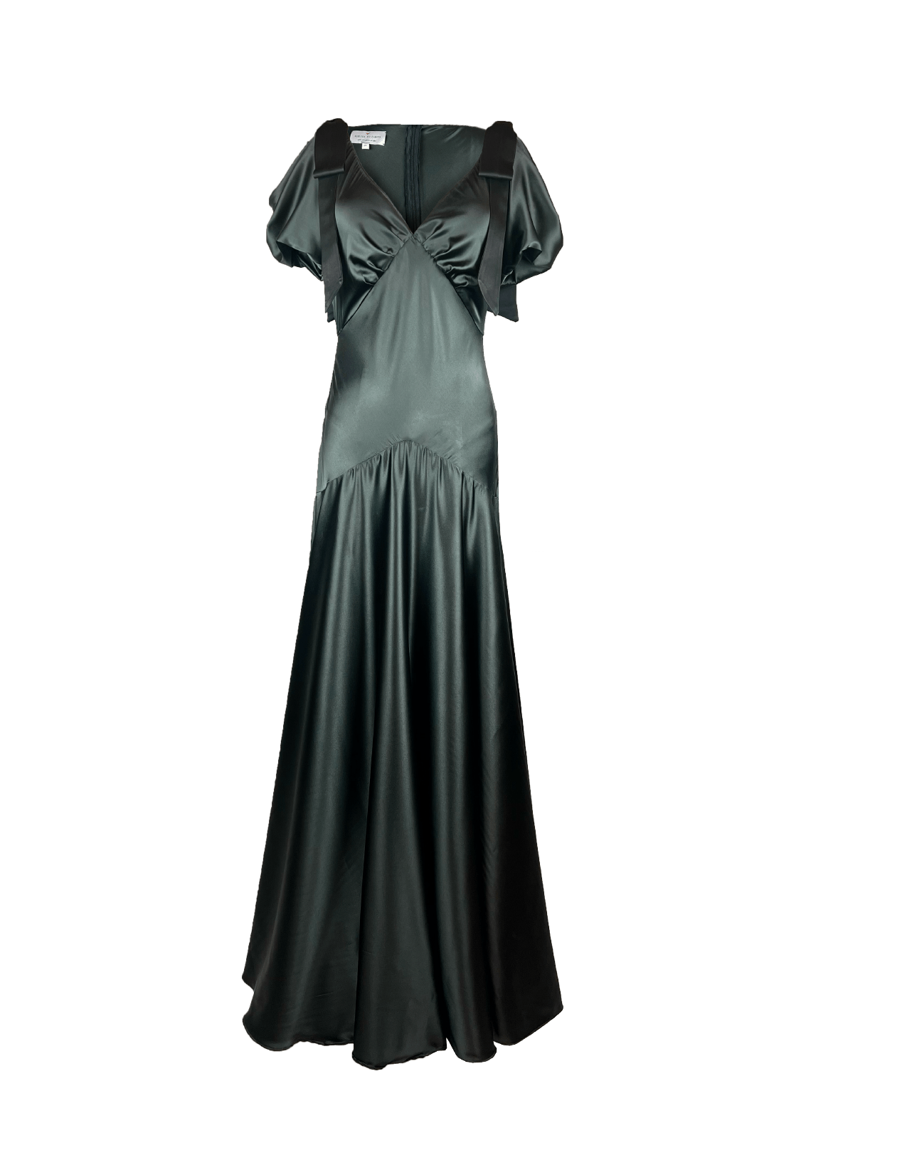 Adoptez l'élégance avec la robe Amara, une luxueuse robe longue confectionnée en charmeuse de soie extensible 100 % invendue, coupée en biais, dans un vert jaspe profond et intense, une teinte forêt sombre au fini satiné doux et soyeux. Les nœuds à chaque épaule ajoutent une touche d'élégance ludique à cette silhouette intemporelle. Cette robe est conçue pour captiver. Ajustée au niveau du corsage et des hanches, elle se fond gracieusement dans une jupe ample, créant du mouvement à chaque pas. Le nœud en satin Amara présente un décolleté en V raffiné, de délicats plis sous la poitrine et un corsage doublé de soie lisse, le tout agrémenté d'une fermeture éclair dans le dos pour plus de confort et de sophistication.