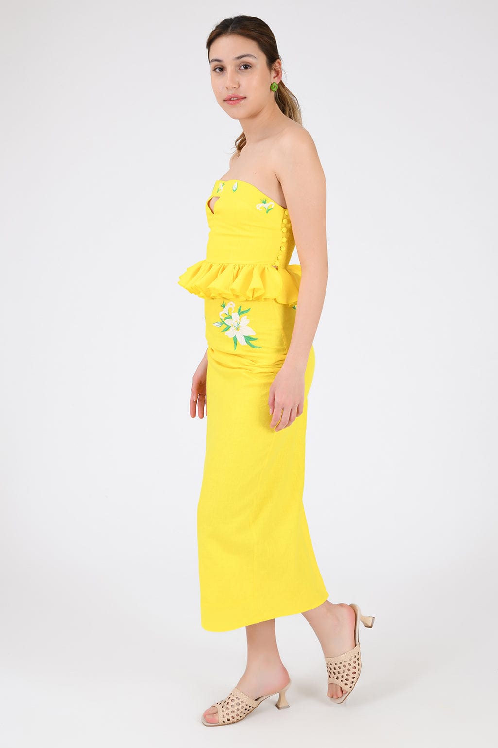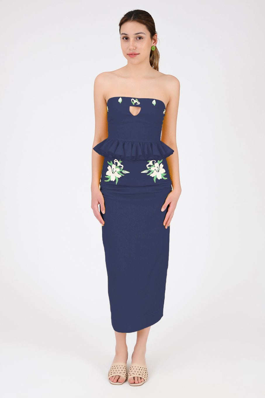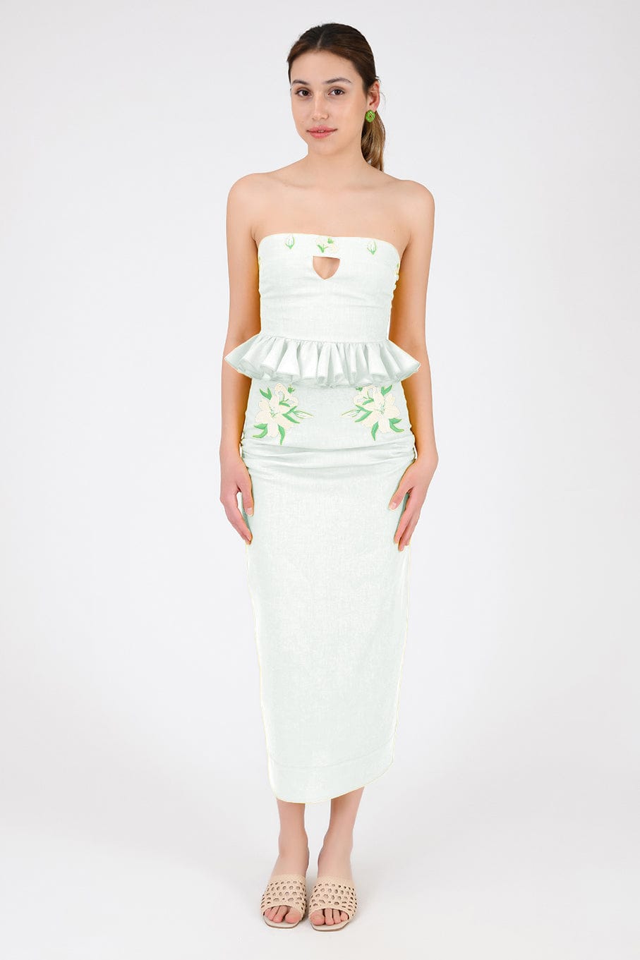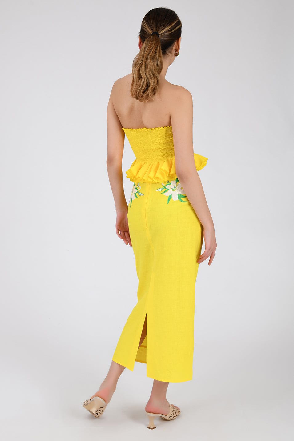Ensemble jupe 2 pièces en lin. Haut bustier à volants et basque, orné de broderies et d'une ouverture goutte d'eau sur le devant, et jupe droite mi-longue fendue dans le dos et fermée par une fermeture éclair.