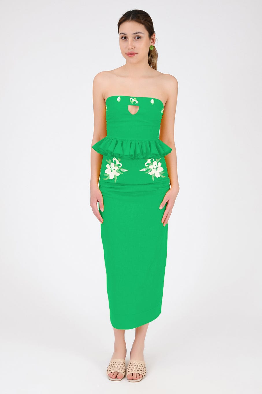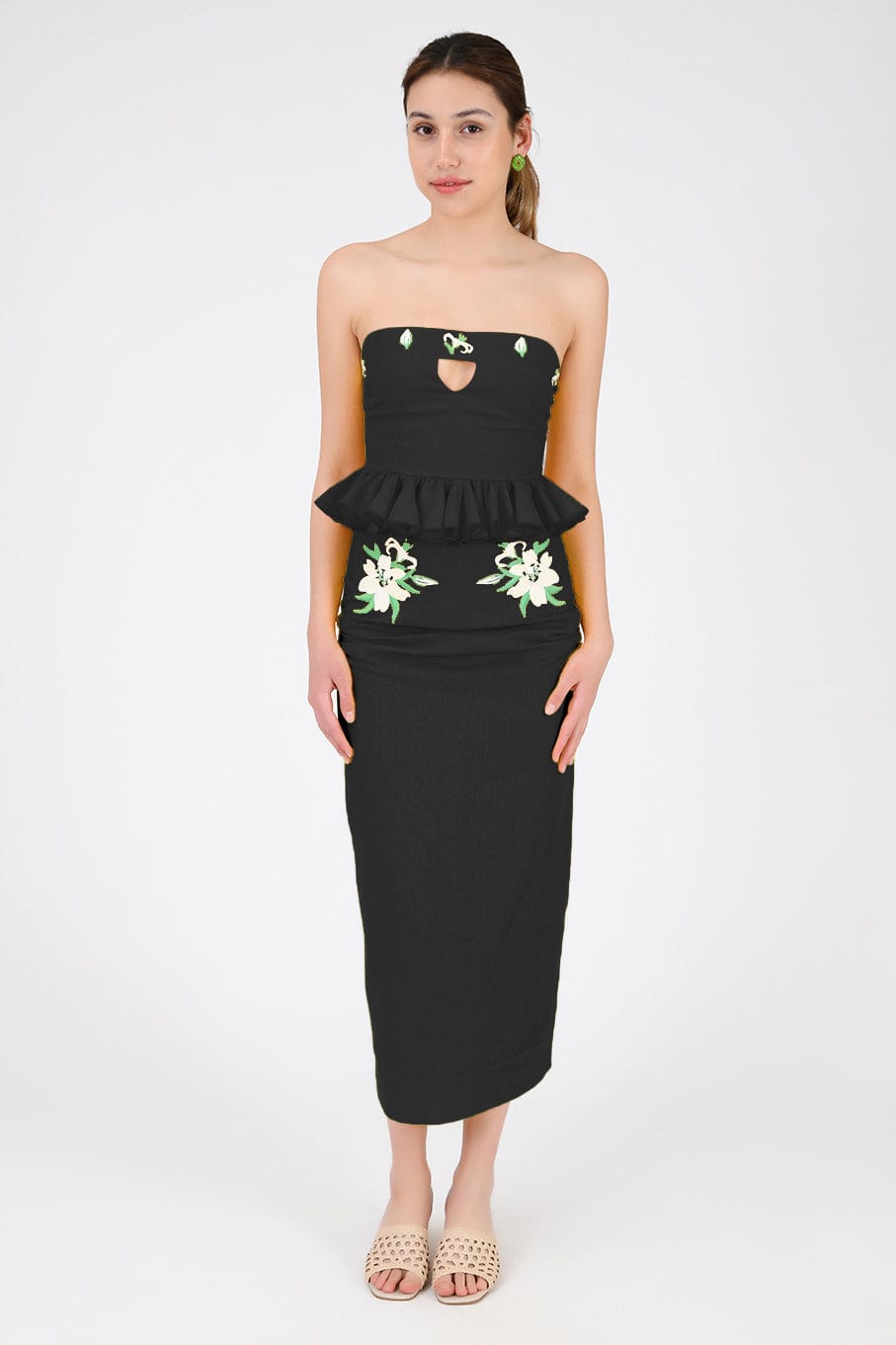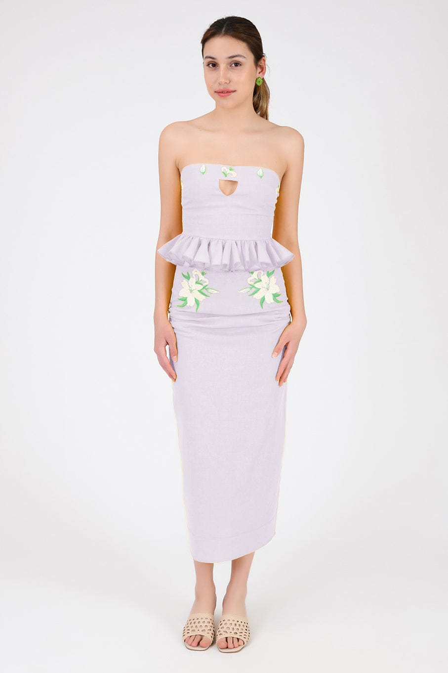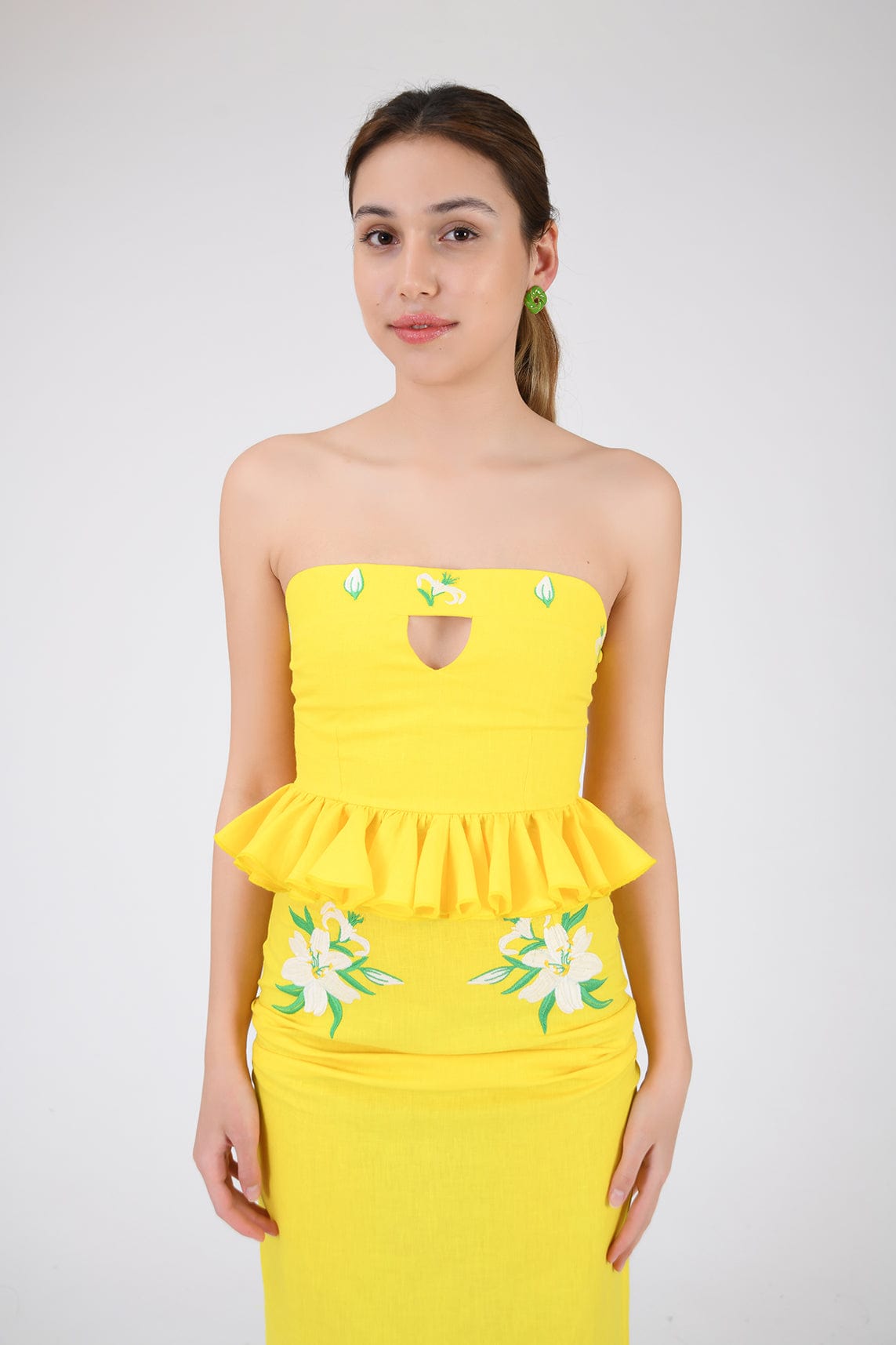Ensemble jupe 2 pièces en lin. Haut bustier à volants et basque, orné de broderies et d'une ouverture goutte d'eau sur le devant, et jupe droite mi-longue fendue dans le dos et fermée par une fermeture éclair.