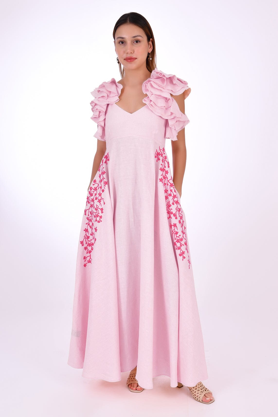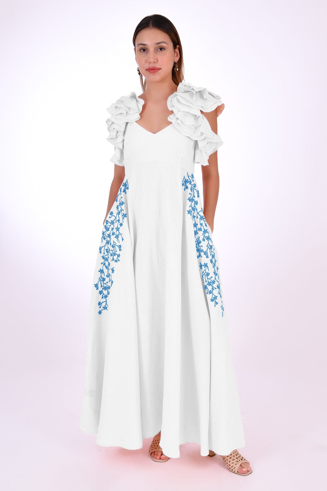 Robe longue nouée dans le dos encadrée de volants sculpturaux et de motifs floraux contrastés détail brodé à la main.