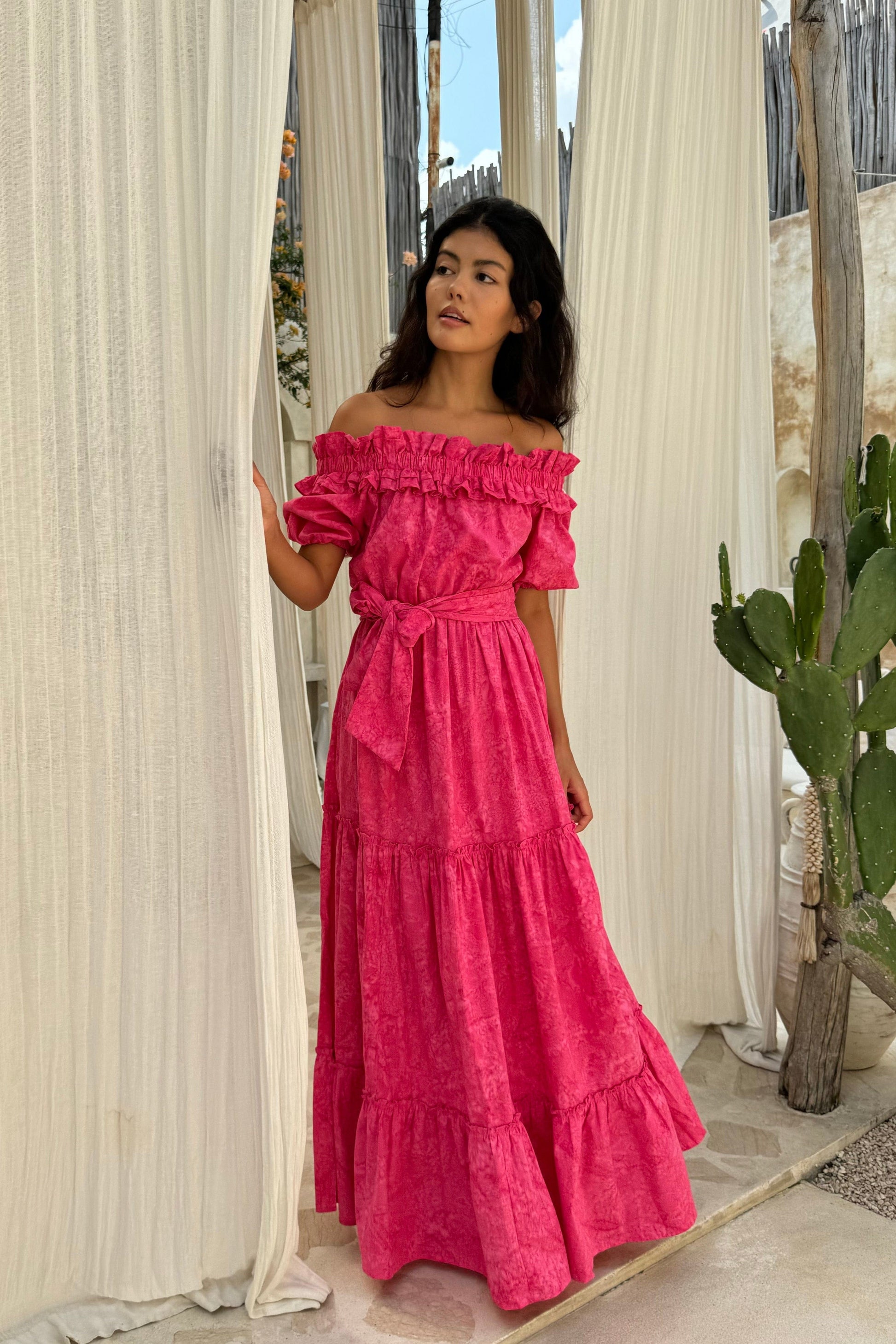 Cette robe longue en coton teint à la main est dotée d'une taille élastique ajustée, ainsi que de volants sur le haut et les manches. Idéale pour une baby shower ou tout autre événement spécial.